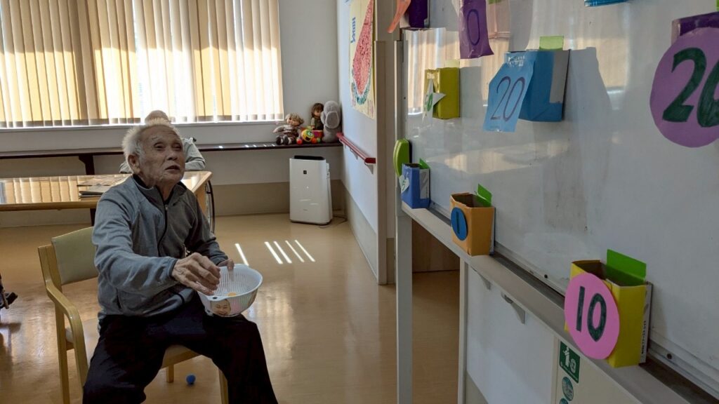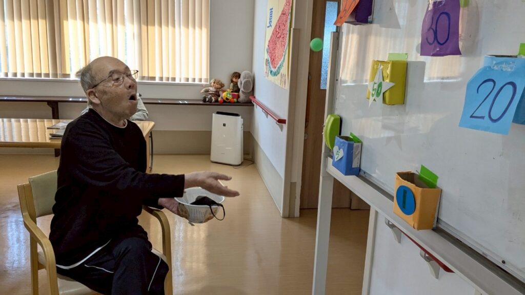 本日のレクリエーションは、ホワイトボードに作られたさまざまな形のゴールにピンポン玉を入れて、点数を競うゲームです✨