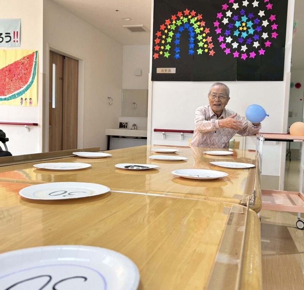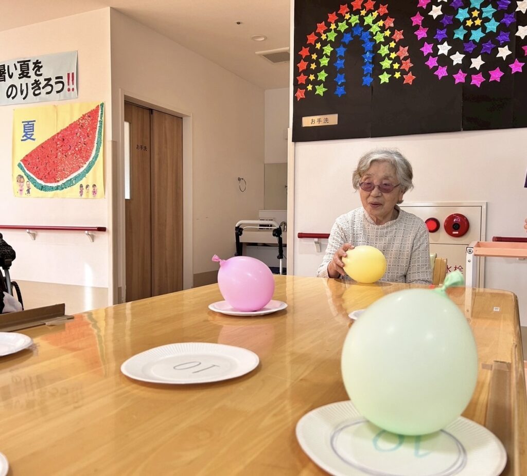 今日のレクは水風船を投げたり転がしたりして紙皿の上に乗せていきます。高得点も出ました!思ったところに転がらない水風船と格闘しました。