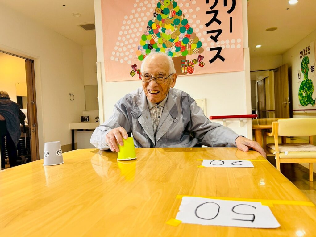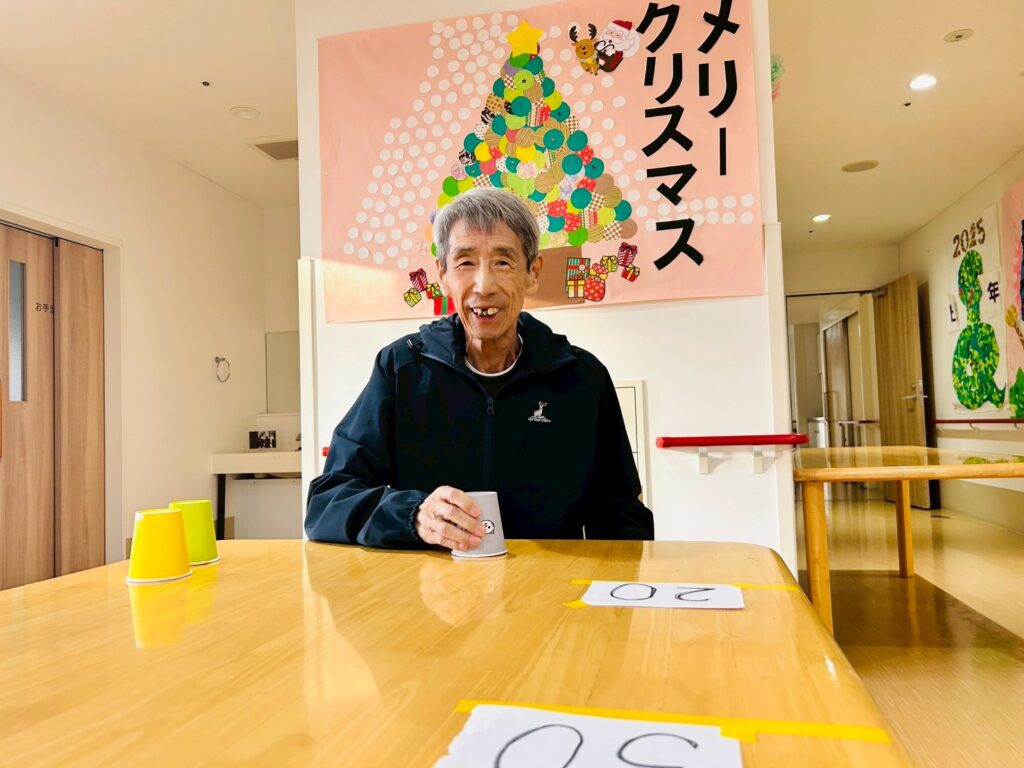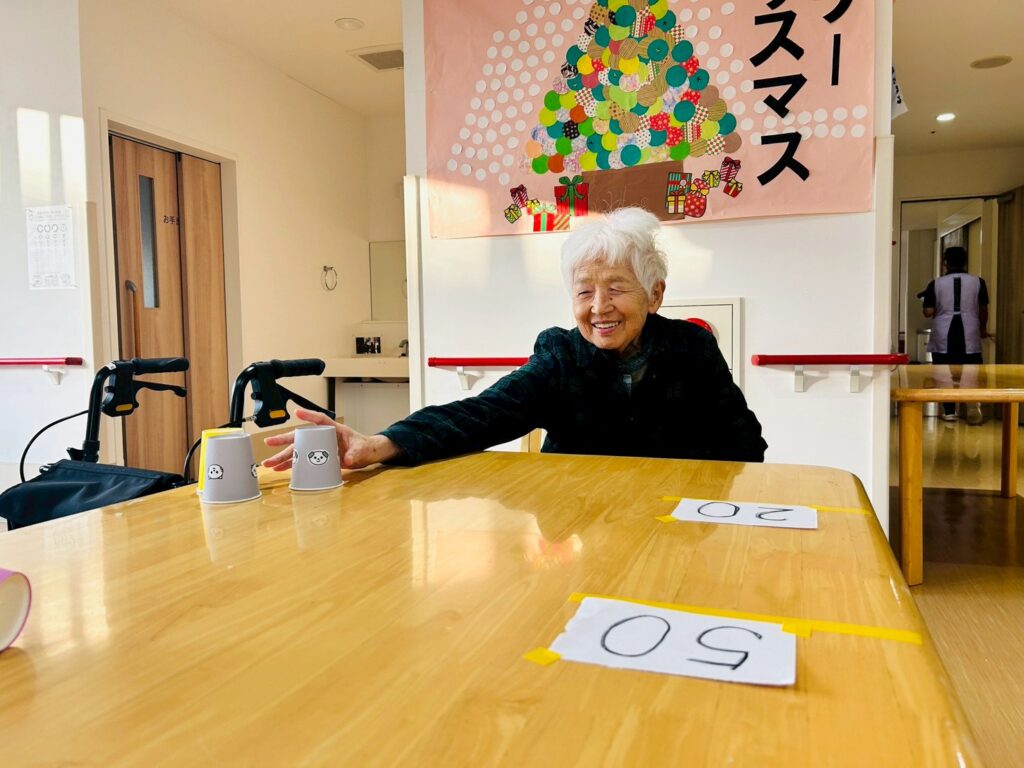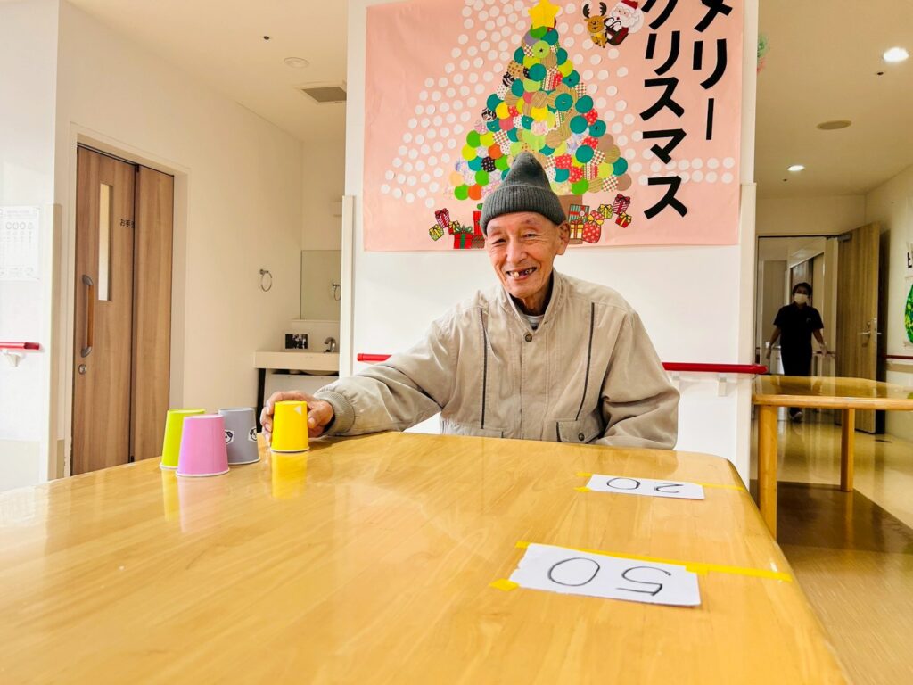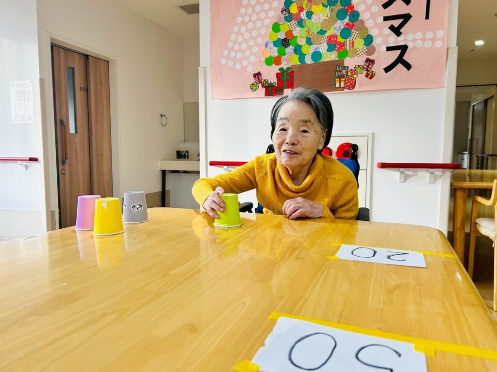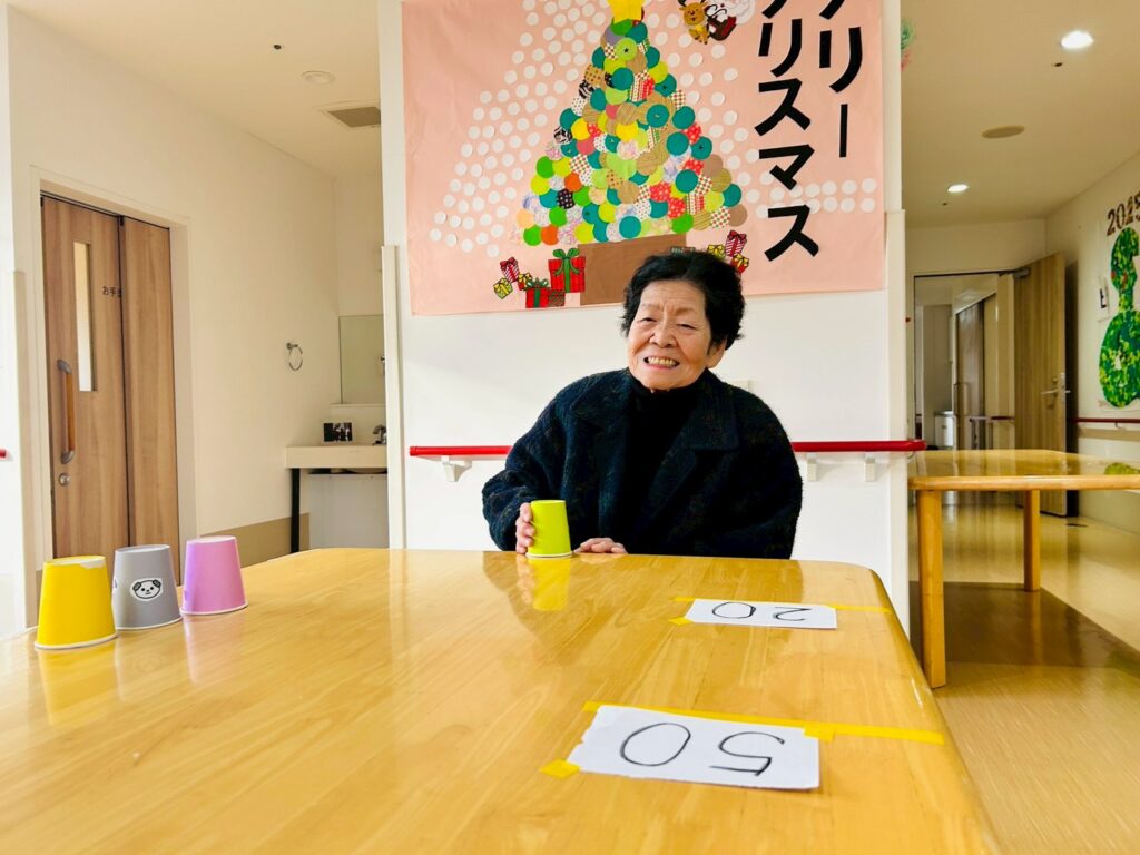 今日のレクリエーションは、紙コップを滑らせ得点をするゲームです。皆さん楽しそうにされていましたよ〰!